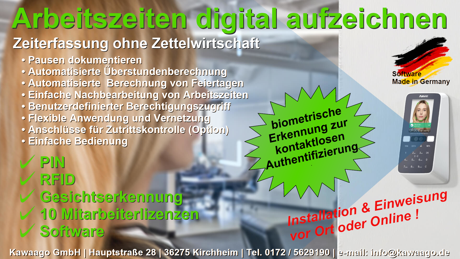 Zeiterfassungs- und Zutrittskontrolllösung für kleine und mittlere Unternehmen Die Arbeitszeiterfassung ist ein zentrales Thema im Arbeitsrecht, das durch die Entscheidungen des Europäischen Gerichtshofs (EuGH) und des Bundesarbeitsgerichts (BAG) erneut in den Fokus gerückt ist. Mit unserem Zeitmanagement System haben Sie eine umfangreiche zuverlässige digitale Zeiterfassung zur Berechnung der Arbeitszeiten und Löhne Ihrer Mitarbeiter. Vielseitige Möglichkeiten neuster biometrischer Algorithmus einschließlich Fingerabdruck Handflächenerkennung und Gesichtserkennung um eine sichere und schnelle Identifizierung zu gewährleisten.